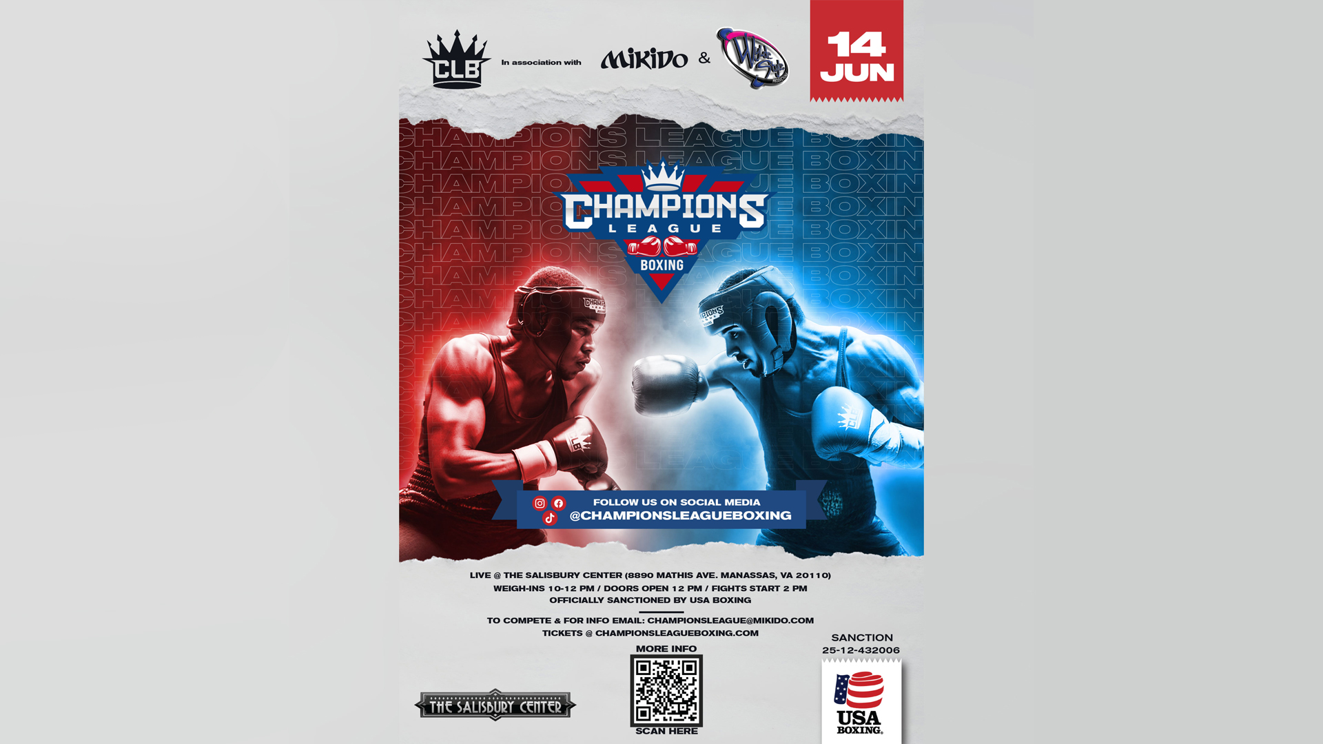 The premiere boxing league in Virginia is back! Champions League Boxing is coming back to The Salisbury Center in Manassas, VA to partner with Wylde Style Productions to give you another top notch event with all the lights, cameras, and action you deserve with a Boxing promotion on Saturday, June 14, 2025. We are joining forces to highlight to the fullest all our athletes, teams, and coaches leading up to, during, and after the fight. We are proud to showcase the future stars of combat sports and give them the platform they deserve! We give all our athletes a pro-like feel with our venue, vibrant audience, and extra perks. We look forward to seeing you on June 14th, at The Salisbury Center (8890 Mathis Ave. Mannasas, VA 20110). There will be food and beverages on site for your dining, drinking and day party pleasure. The card will be in high demand and we will have limited bouts, if interest in competing or any questions on the event, please contact: [email protected] for CLB match making. We look forward to seeing you there or at an upcoming CageZilla, TCB or Wylde Style Event!